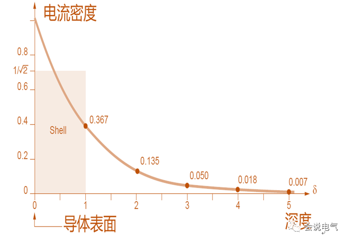 实际上,密度从导体的外围到中心呈指数下降。在 δ 深度处,密度仍然是