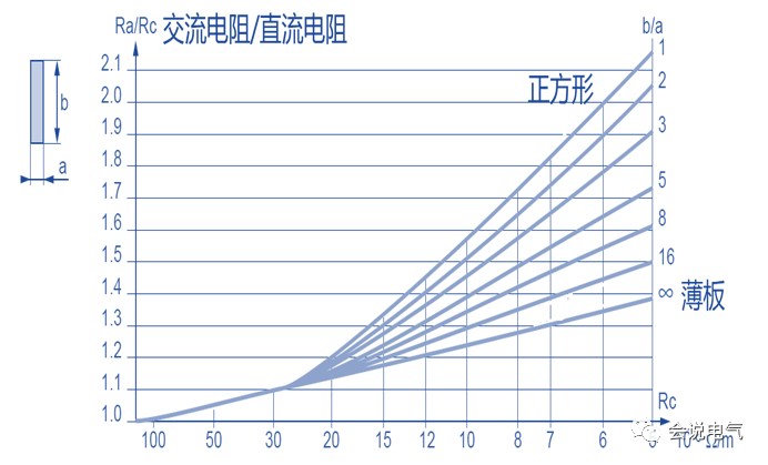 可以看出b/a=1即正方形截面,交流电阻与直流电阻比将近2.15,而薄板b/a趋于无穷大时,交直流电阻比只有近1.4,载流量提高53%,减少大量能量损耗。对于5*100mm铜排b/a=20,与10*50mm铜排b/a=5对比,交流电阻大幅减少。