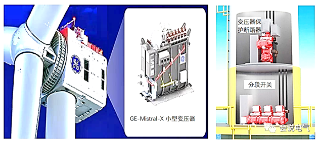 国际风电厂家Vestas、GE、西门子歌美飒等纷纷将变压器、开关设备组成的箱变置于自己大容量风机机舱内,而很多风机厂家还是选择与陆上风电类似的方法,将箱变置于检修平台上,在步入平价时代的中国风电将箱变上置到风机机舱,更接近于电源,在机舱内部就地升压输电,有很大的经济效益。