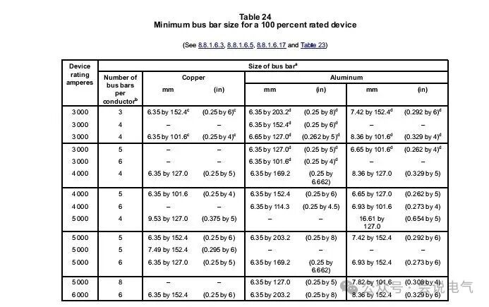 对于低压开关柜、配电盘,美标也有相应的铜排规格的规定,如UL891配电盘对于不同电流的铜排都是采用1/4英寸25.4/4=6.35mm厚的铜排,不同电流等级,使用铜排的宽度和根数不同。