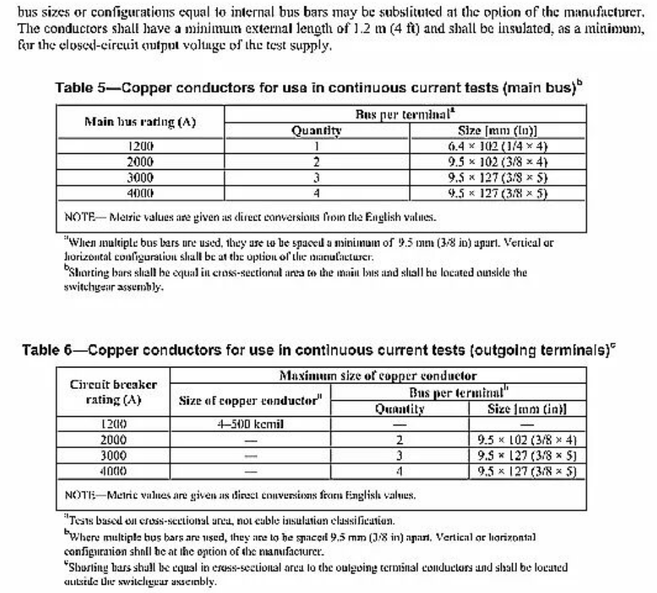 按照标准,对于连续电流(温升)试验使用铜排规格,1200A使用一根6.4×102=652.8mm2铜排,2000A使用2根9.5×102mm铜排,截面积=2×9.5×102=1938mm2,3000A使用3根9.5×127mm铜排,截面积=3×9.5×127=3619.5mm2,4000A使用4根9.5×127mm铜排,截面积=4×9.5×127=4826mm2。