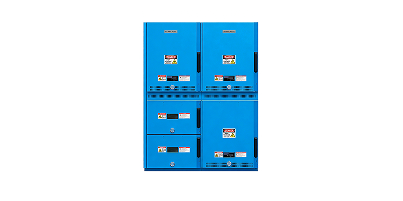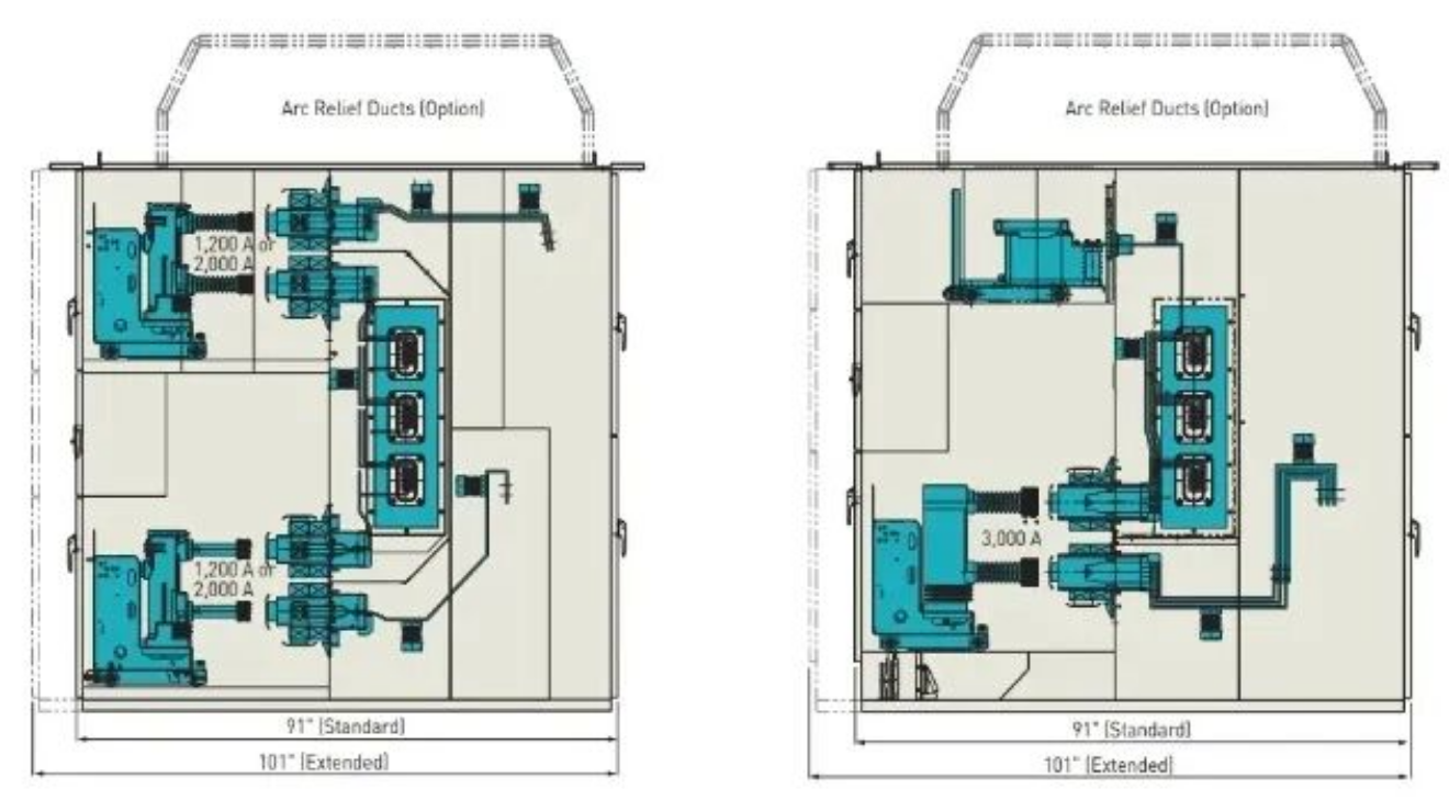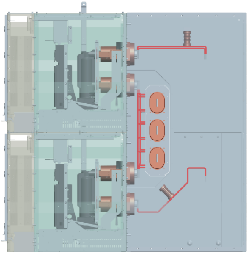 美标中压铠装开关柜,标准电流规格1200、2000、3000、4000A,上下双层断路器手车,母线位于后柜中间部位。上层断路器出线在后柜上部,电缆通过下部垂直通道到上部与铜排连接。下层断路器进出线直接底板进出连接。由于上下双层断路器布置,隔室之间不允许有通风孔,而且美标温升上限比IEC标准低10k,因此铜排使用量大。